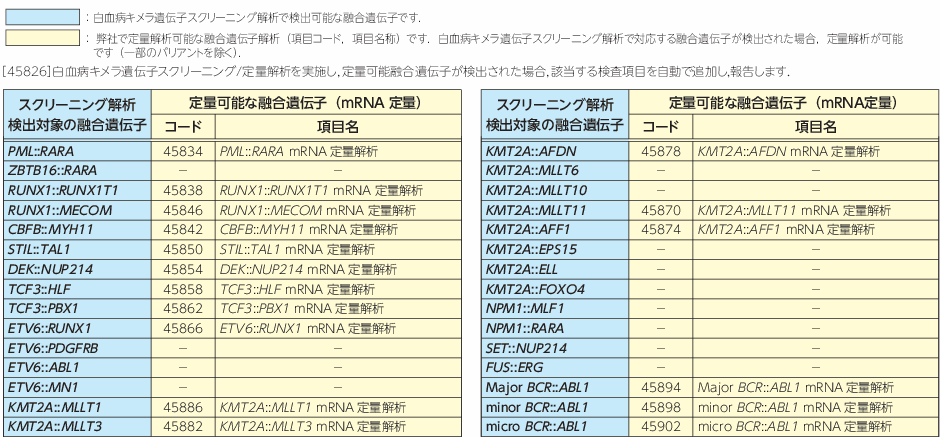 各種造血器腫瘍において出現頻度の高い28種のキメラ遺伝子の有無を一括判定する検査。